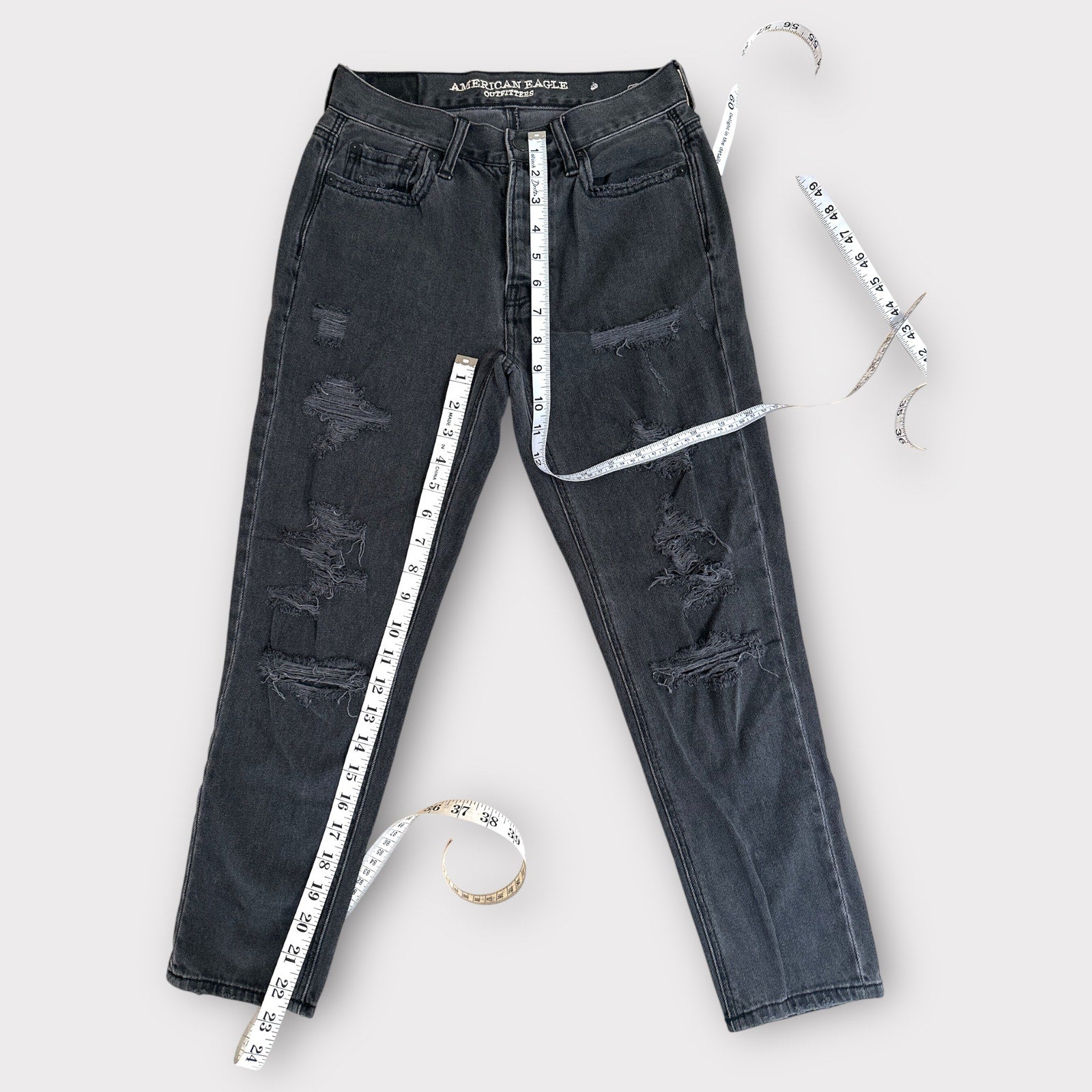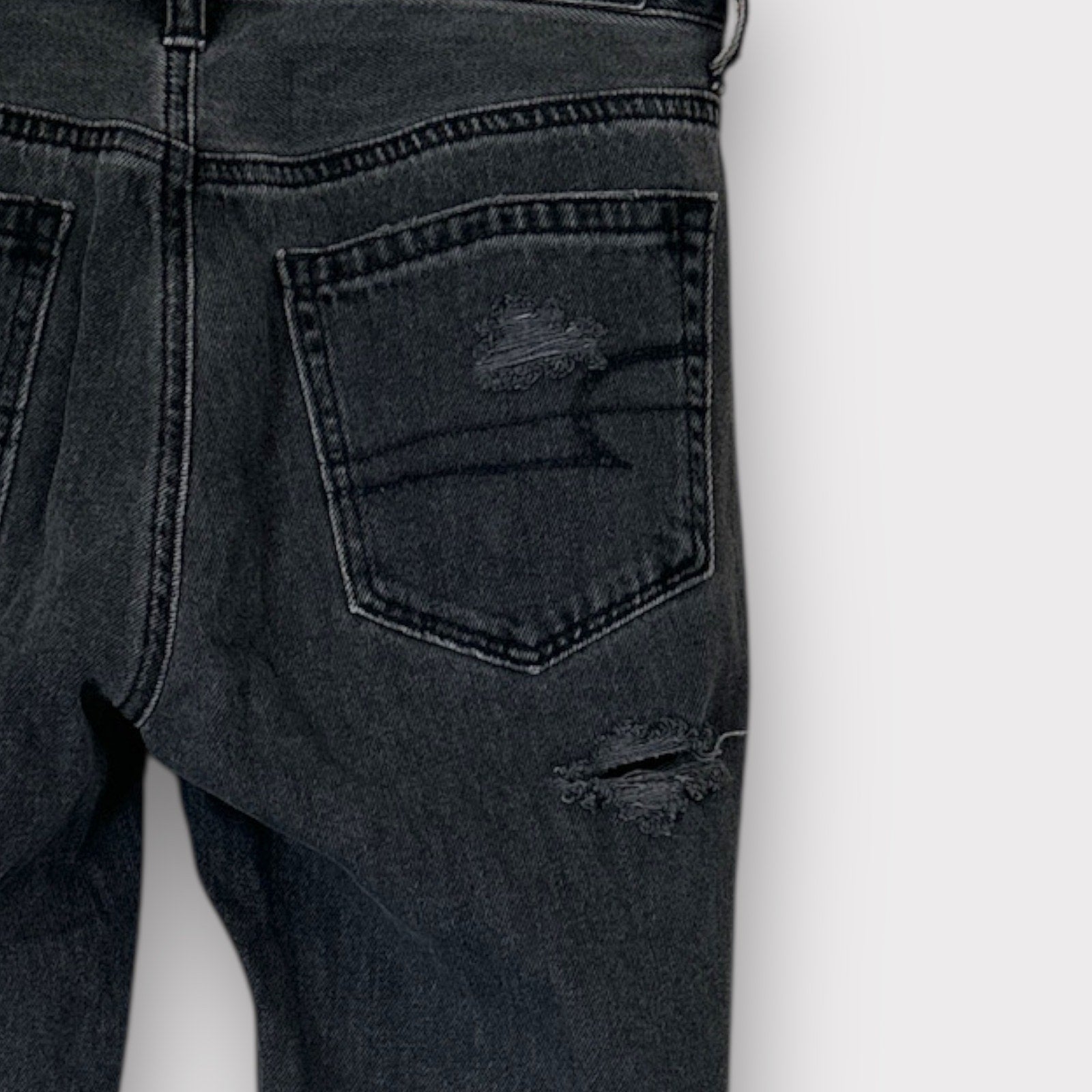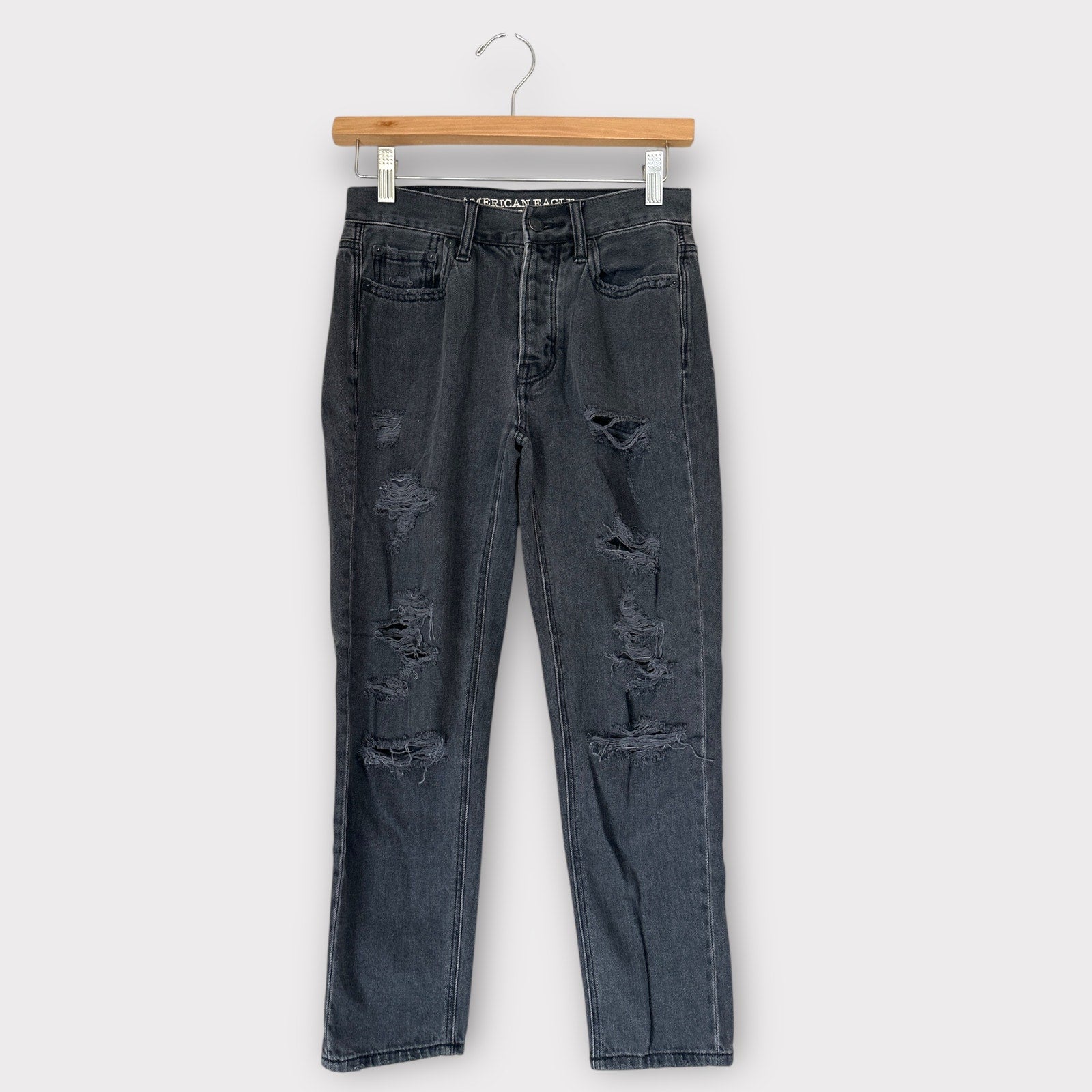 Step out in style with these trendy American Eagle vintage high-rise distressed jeans! The black vintaged wash and subtle distressing give them a cool, lived-in feel, perfect for creating effortless on-trend looks.