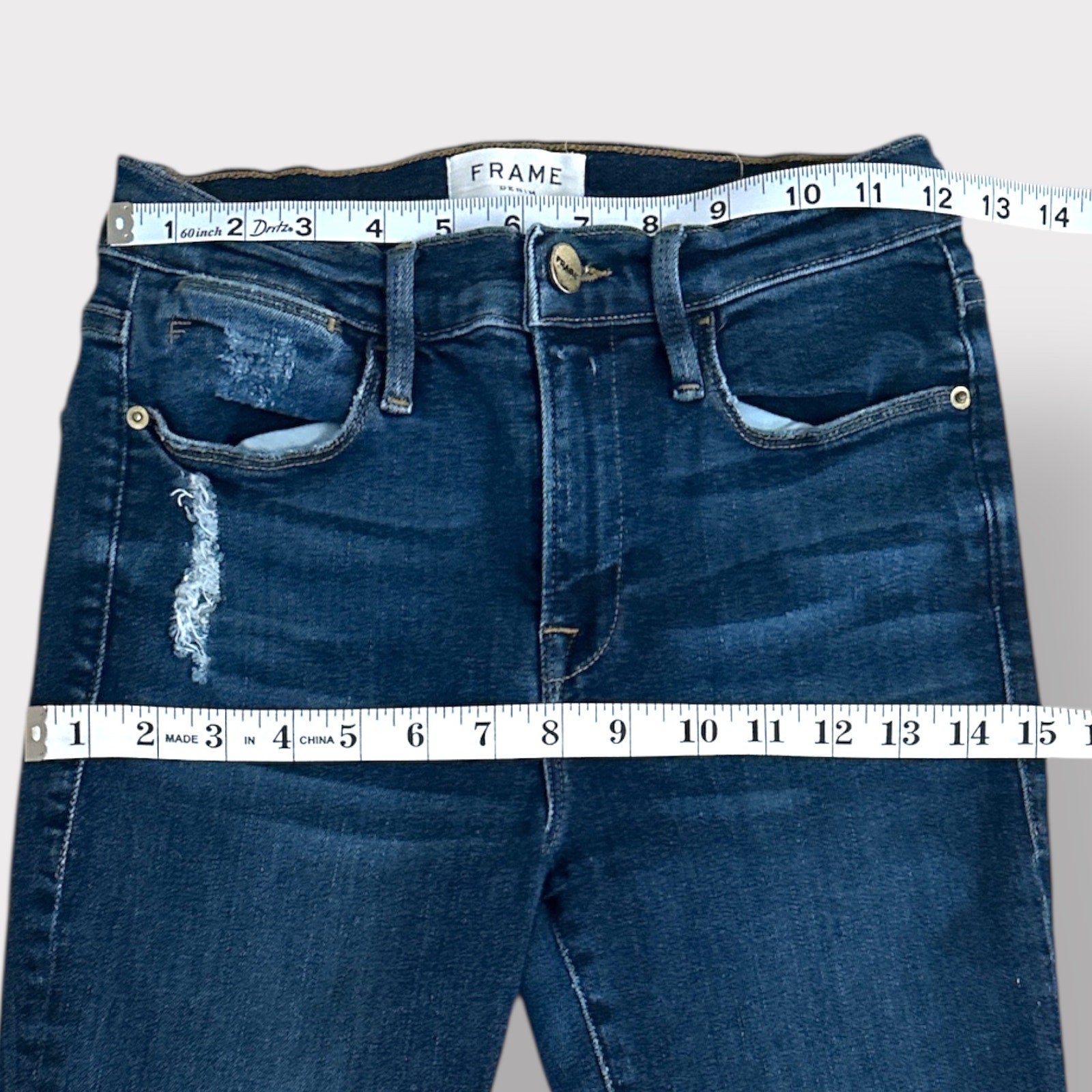 Frame Le High Skinny Distressed Jeans, size 26. These jeans are a fun, trendy, and popular choice from a premium denim brand. The dark wash and distressed detailing give them a stylish edge, perfect for any casual or dressed-up look. Minimal wear, in excellent used condition.