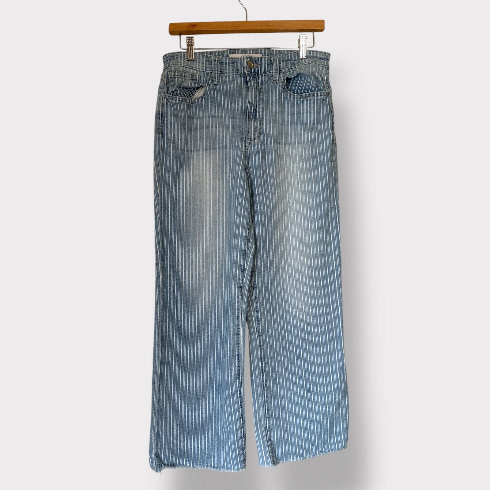 These fun and trendy Joes Jeans pinstriped mom capris are perfect for adding a touch of style to your wardrobe! The high rise and wide cropped fit create a flattering silhouette, while the blue with white pinstripes adds a playful touch. Made from a comfortable cotton blend with no stretch, these jeans are in excellent condition and ready for a new home.