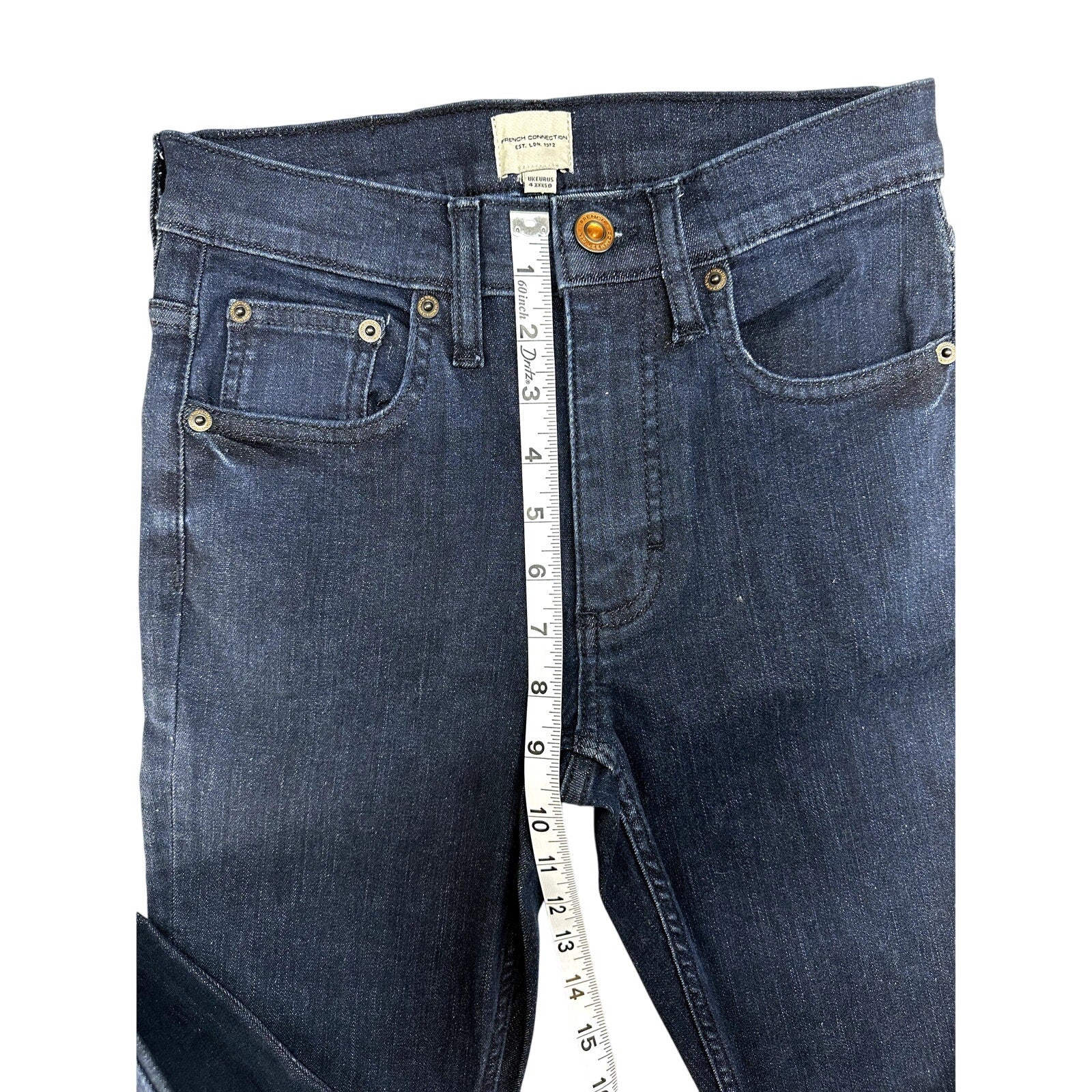 These French Connection skinny jeans are a stylish and trendy addition to your wardrobe. The dark wash color is versatile and can be dressed up or down. They have a comfortable fit with good stretch, making them perfect for all-day wear. The jeans are in new condition with tags attached, so you can be confident in their quality.